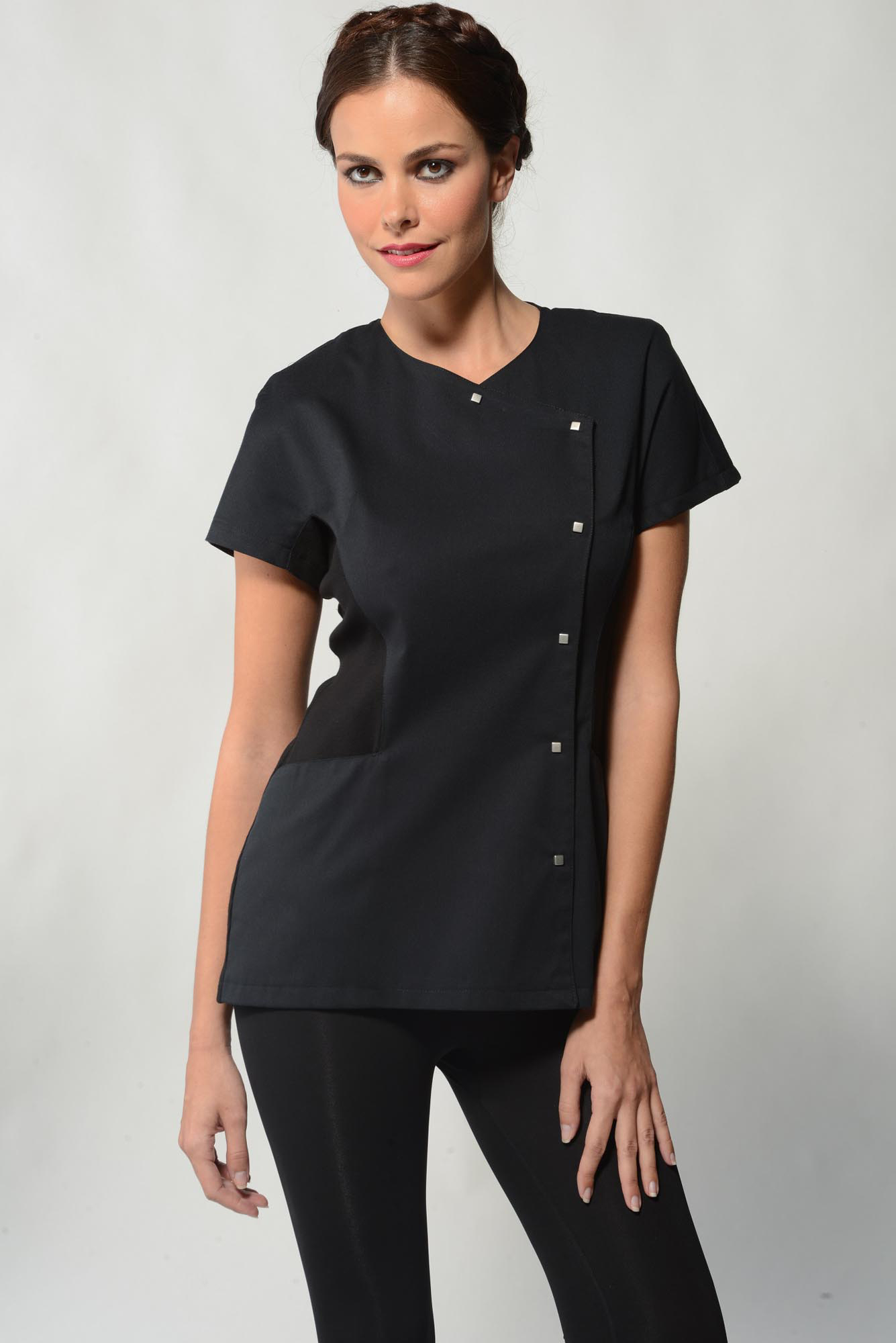 Top asymétrique à manches courtes kimono bien coupé fermé par des boutons pression carrés argentés métallisés et une poche de chaque côté. De plus, avec des inserts latéraux élastiques pour un meilleur mouvement. Le look moderne offre une apparence professionnelle et élégante.