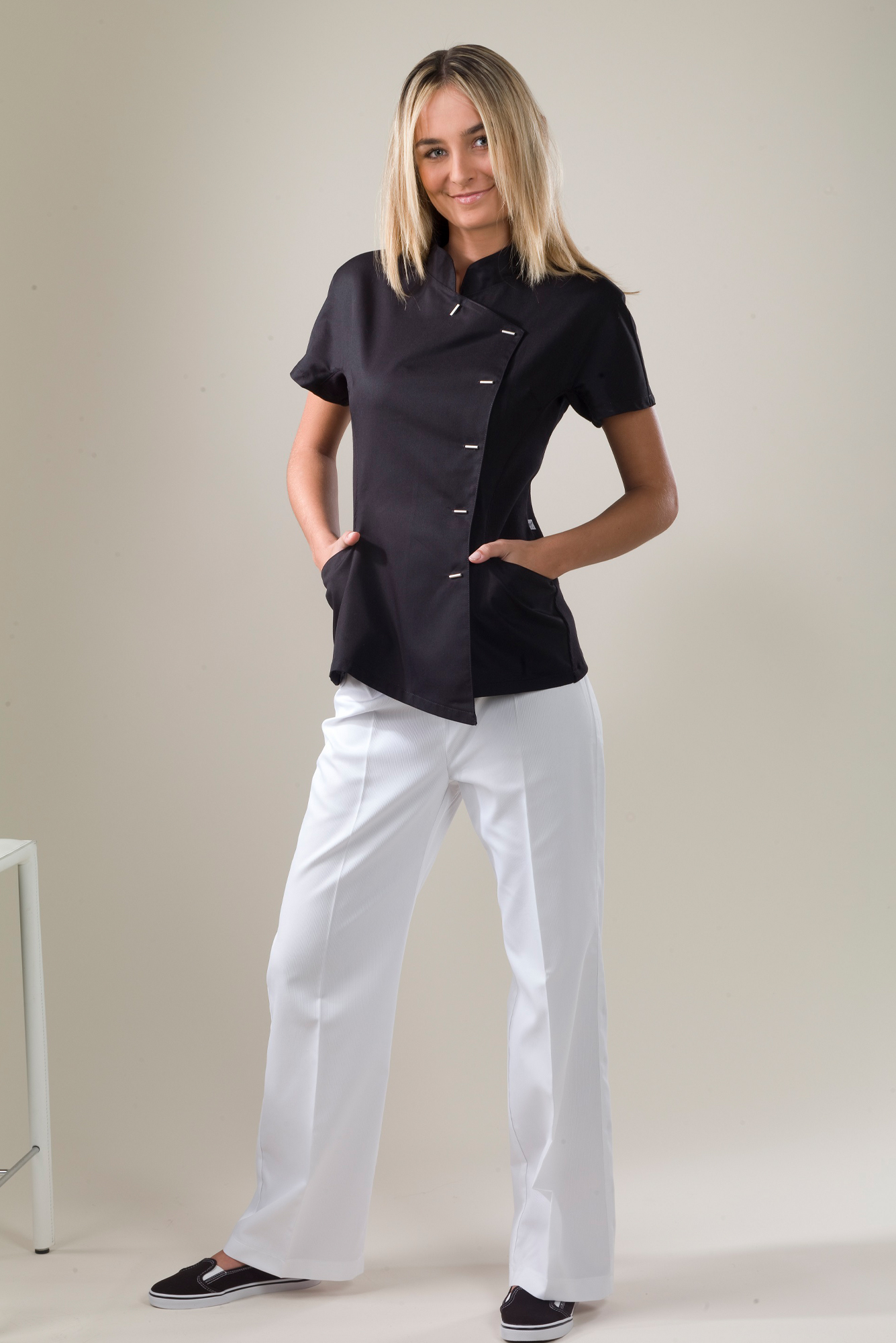 Well-tailored asymmetric top with kimono sleeves, closure by silver metallic-barrette buttons and a Mao style collar. Additionally with two side pockets and elasticized side inserts for easier movement.