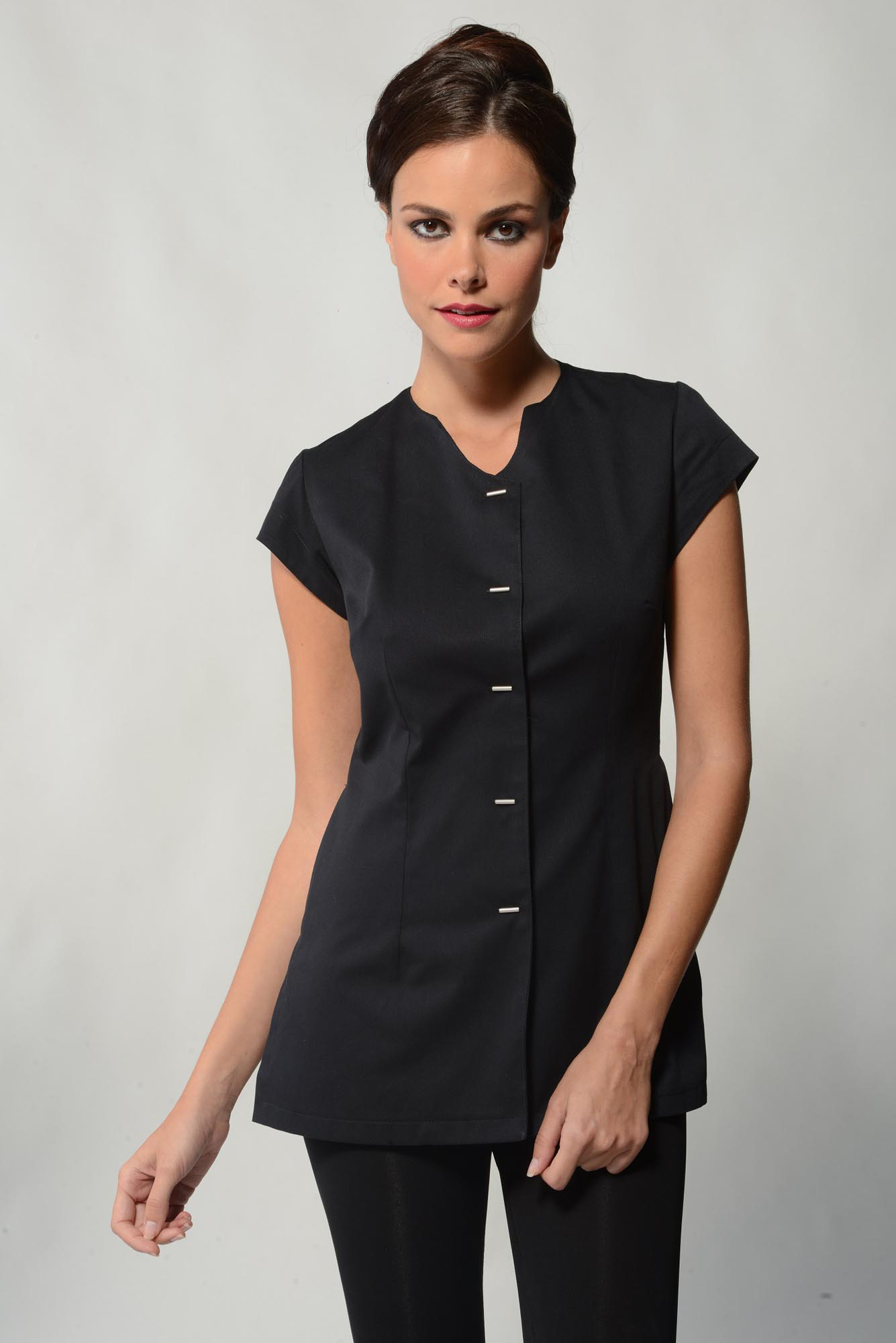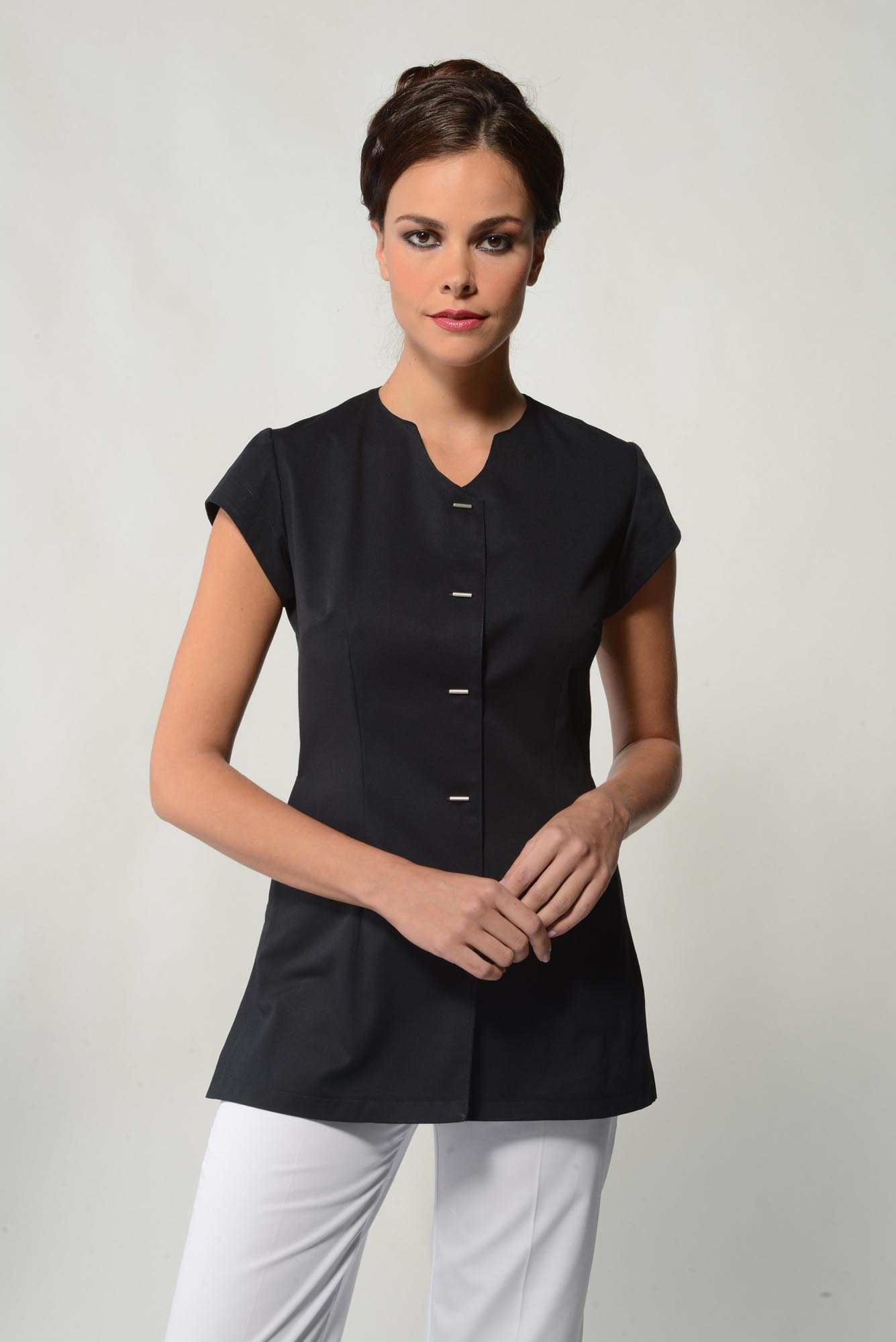Elegant short-sleeved top with a pretty mixed crew and v-neck closed by four double-barrette metallic buttons. Additionally with side slits and lateral pockets on both sides.